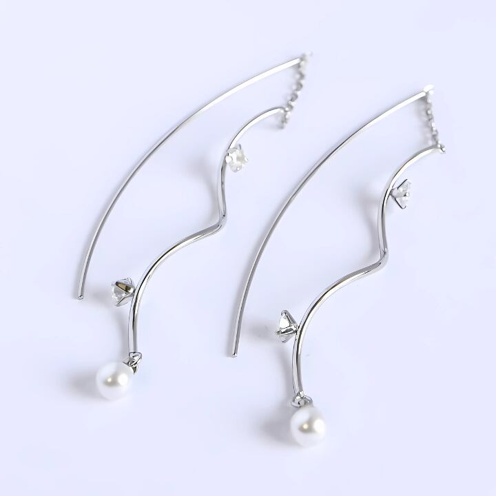 18K ウェーブ パール czダイヤ チェーンピアス シルバー